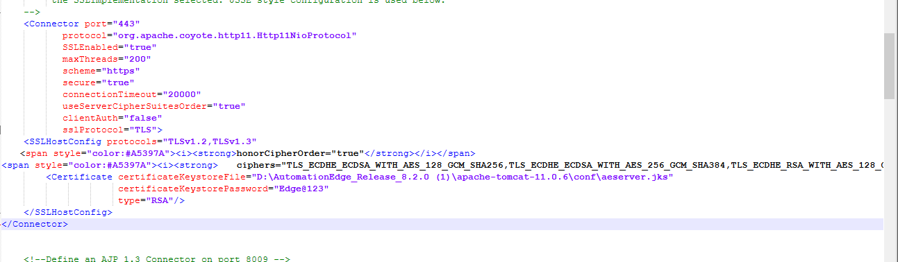 <Certificate certificateKeystoreFile="D:\AutomationEdge_Release_8.2.0 (1)\apache-tomcat-11.0.6\conf\aeserver.jks"